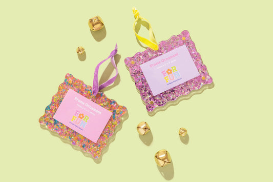 FOR FUN - Acrylic Frame Ornament - Assorted Confetti Colors: Pink w/ Purple Ribbon
