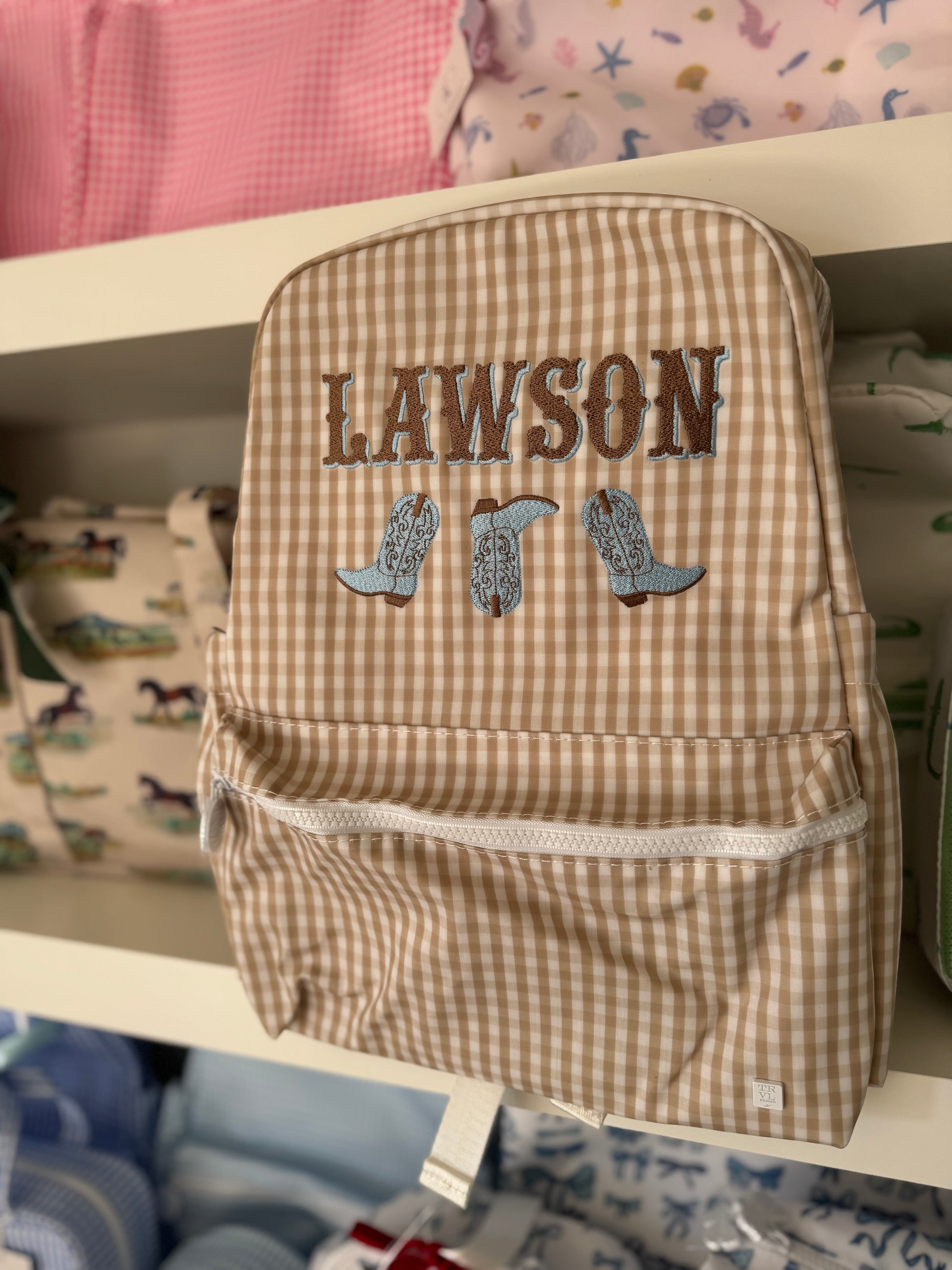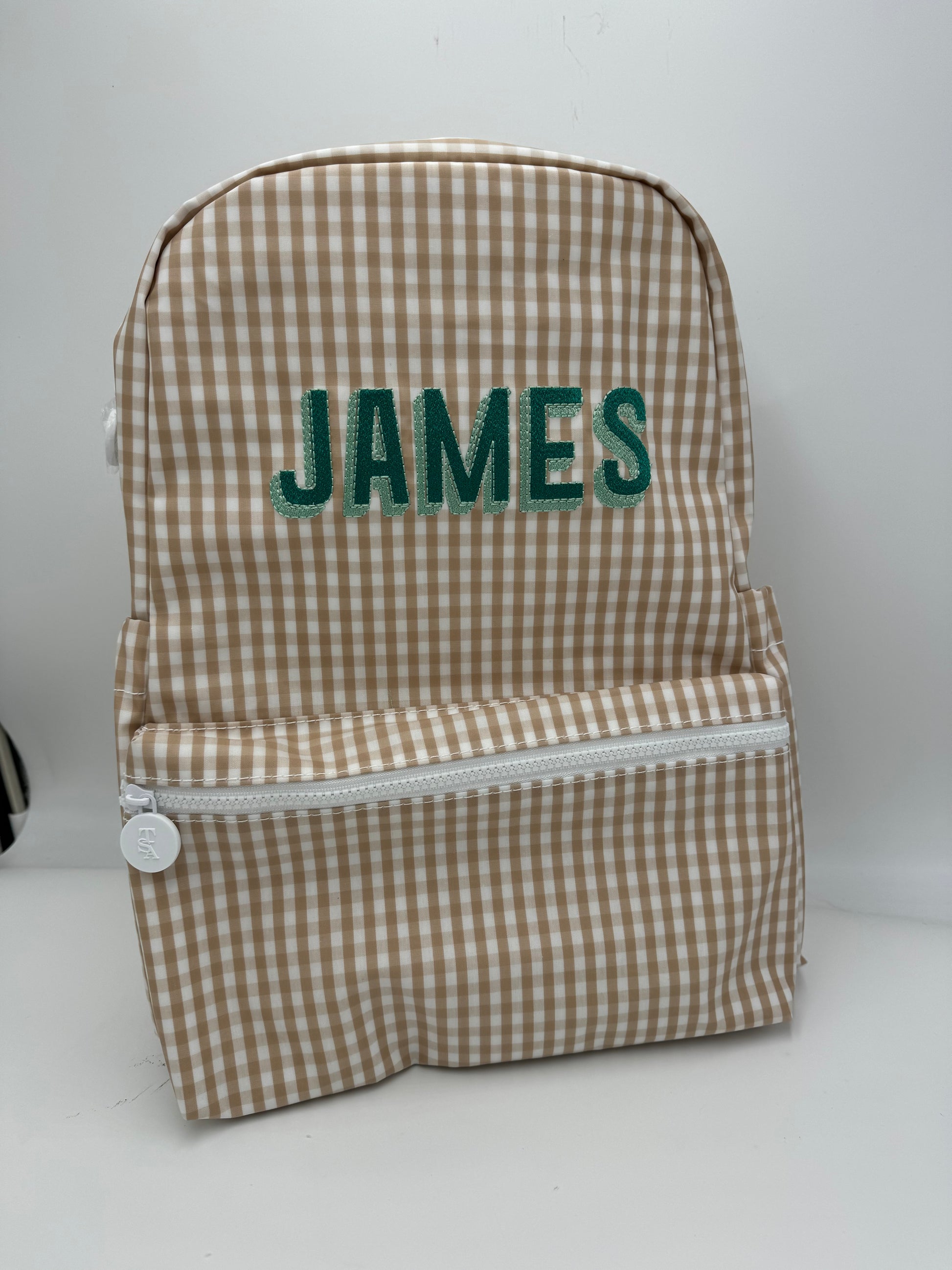 We are loving the roominess and function of this backpacker! Two-way top zip for easy access with a front zip pouch for the necessities, padded & adjustable comfort straps, 2 outside elastic bottle pockets that is made in a lightweight design and our signature coated Gingham. They are wipeable inside and out, and lined in poly twill.