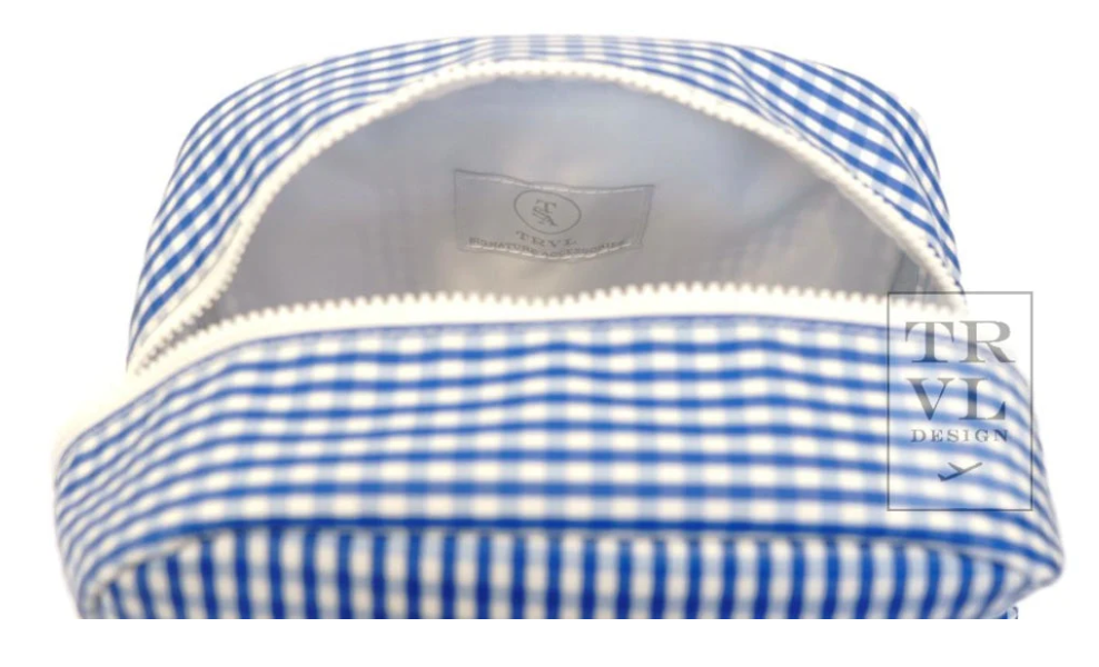 We are loving the roominess and function of this backpacker! Two-way top zip for easy access with a front zip pouch for the necessities, padded & adjustable comfort straps, 2 outside elastic bottle pockets that is made in a lightweight design and our signature coated Gingham. They are wipeable inside and out, and lined in poly twill.