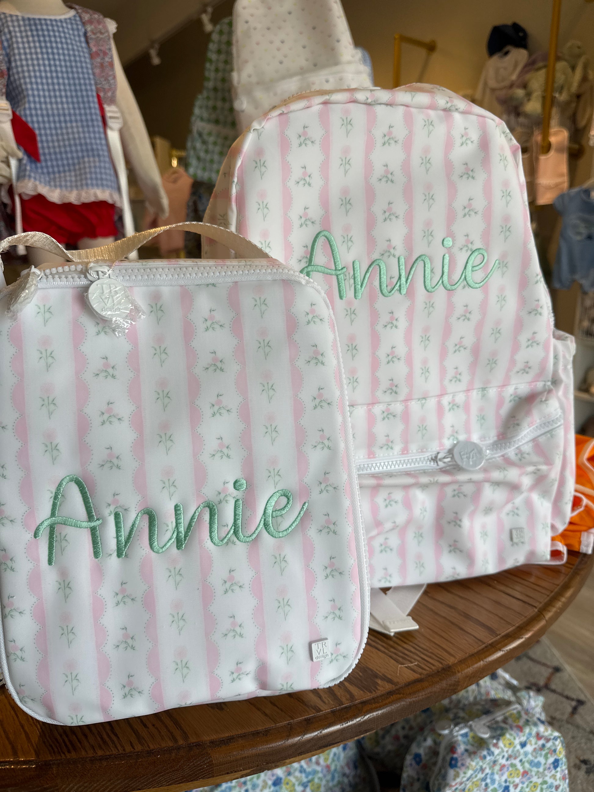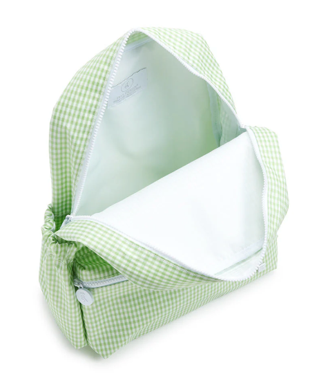 We are loving the roominess and function of this backpacker! Two-way top zip for easy access with a front zip pouch for the necessities, padded & adjustable comfort straps, 2 outside elastic bottle pockets that is made in a lightweight design and our signature coated Gingham. They are wipeable inside and out, and lined in poly twill.