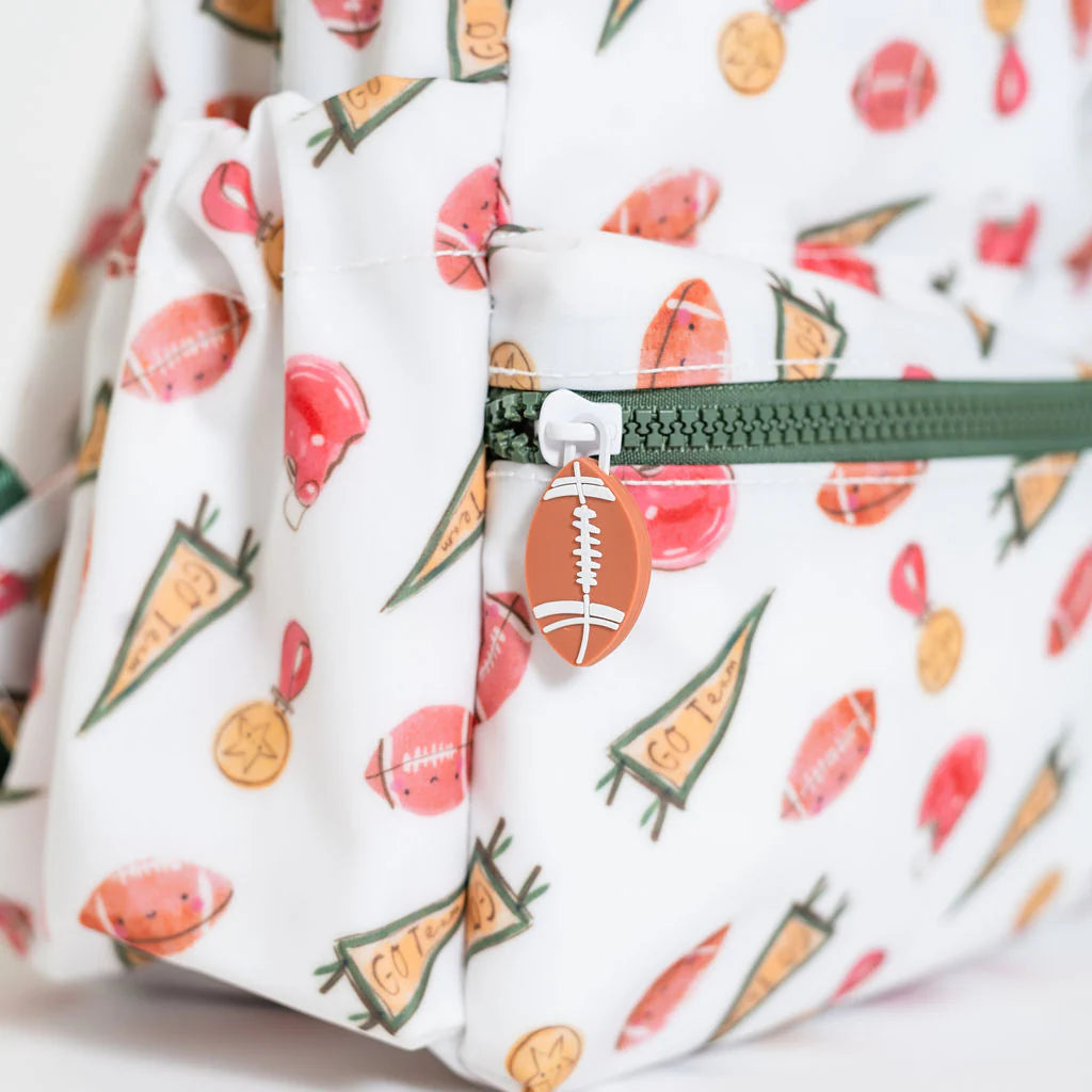 We are loving the roominess and function of this backpacker! Two-way top zip for easy access with a front zip pouch for the necessities, padded & adjustable comfort straps, 2 outside elastic bottle pockets that is made in a lightweight design and our signature coated Gingham. They are wipeable inside and out, and lined in poly twill.