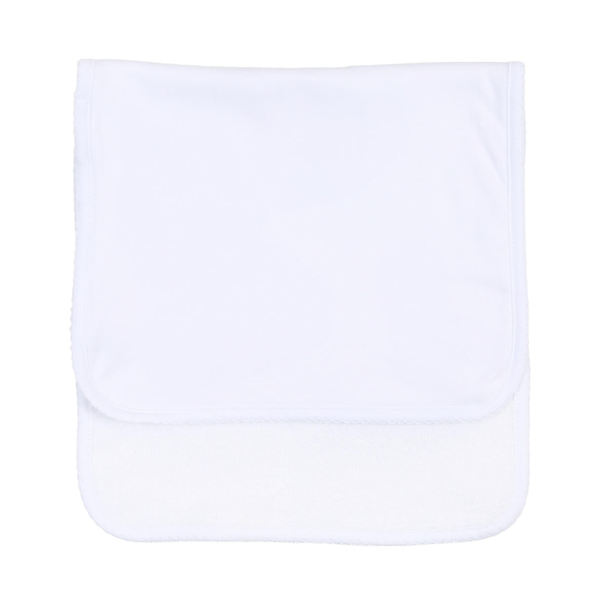 Spit up in style with our Magnolia Baby Burp Cloth! Made from 100% pima cotton and featuring a pink picot trim, it's as soft as it is practical. Personalize with custom embroidery for a unique touch.