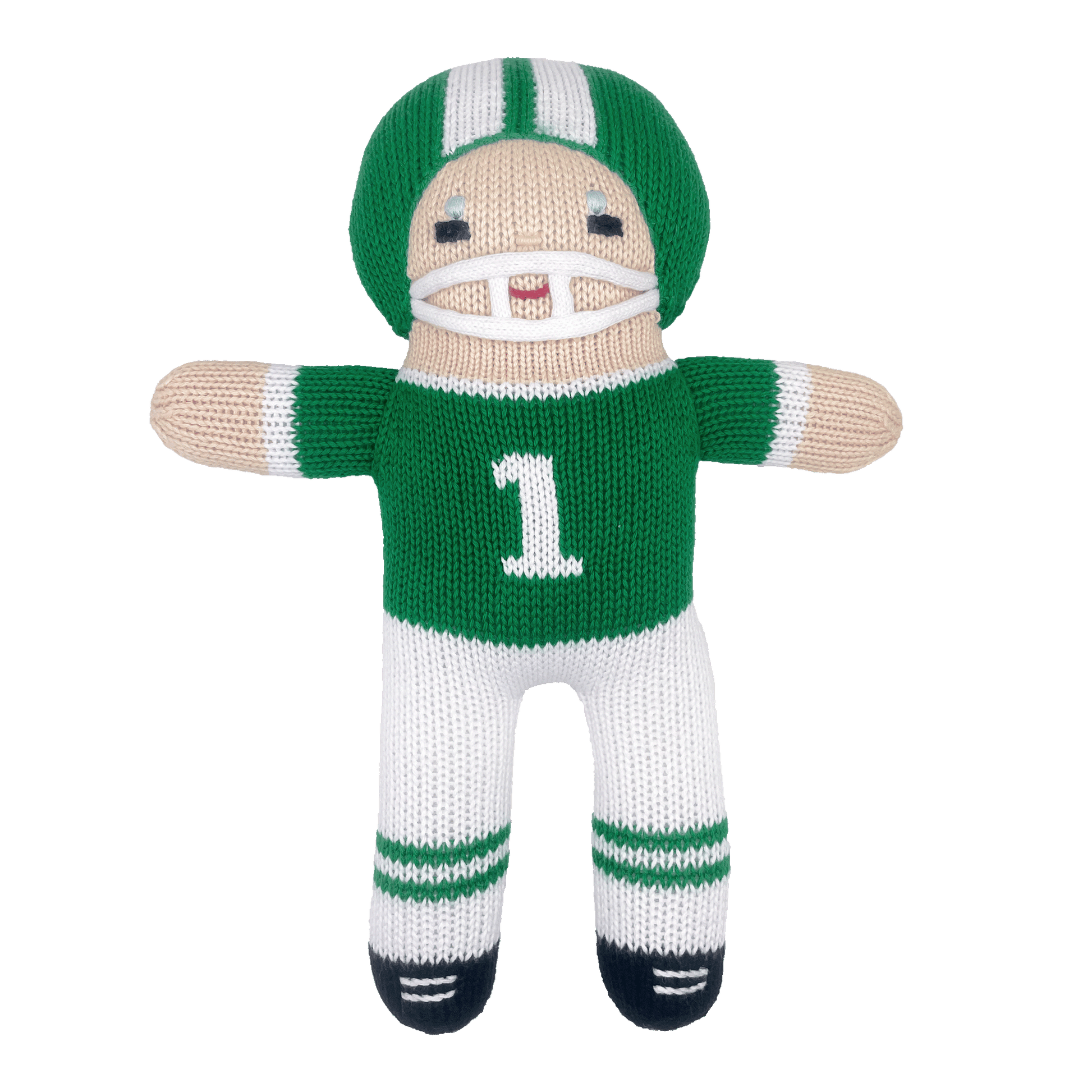 These knit football player dolls are handmade using all-natural super soft 100% cotton yarns and eco-friendly dyes making a safe toy for kids of all ages! Don't be afraid to take these knit football player dolls with you to the game because they are durable and easy to care for - just machine wash and lay flat to dry!