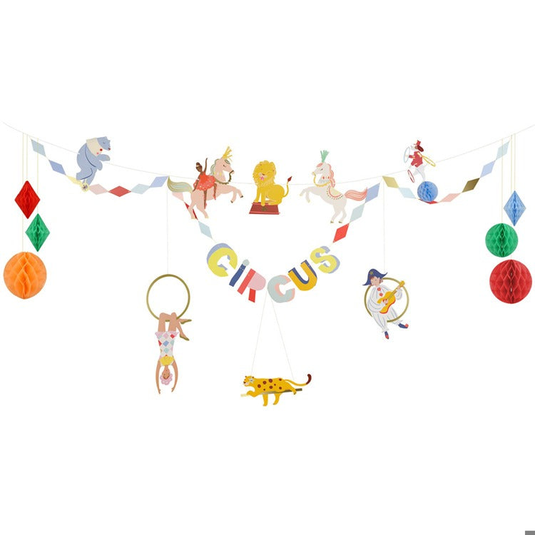 The Circus Garland is a whimsical and colorful decoration perfect for adding a touch of fun to any event or space. This garland features a variety of circus-themed elements such as clowns, acrobats, animals, and circus tents. Each piece is intricately designed and handcrafted to create a festive and playful atmosphere. Hang this garland at a birthday party, carnival, or circus-themed event to instantly elevate the decor. Made from high-quality materials, this garland is durable and can be reused for multiple occasions. Add a touch of magic and nostalgia to your next celebration with the Circus Garland.