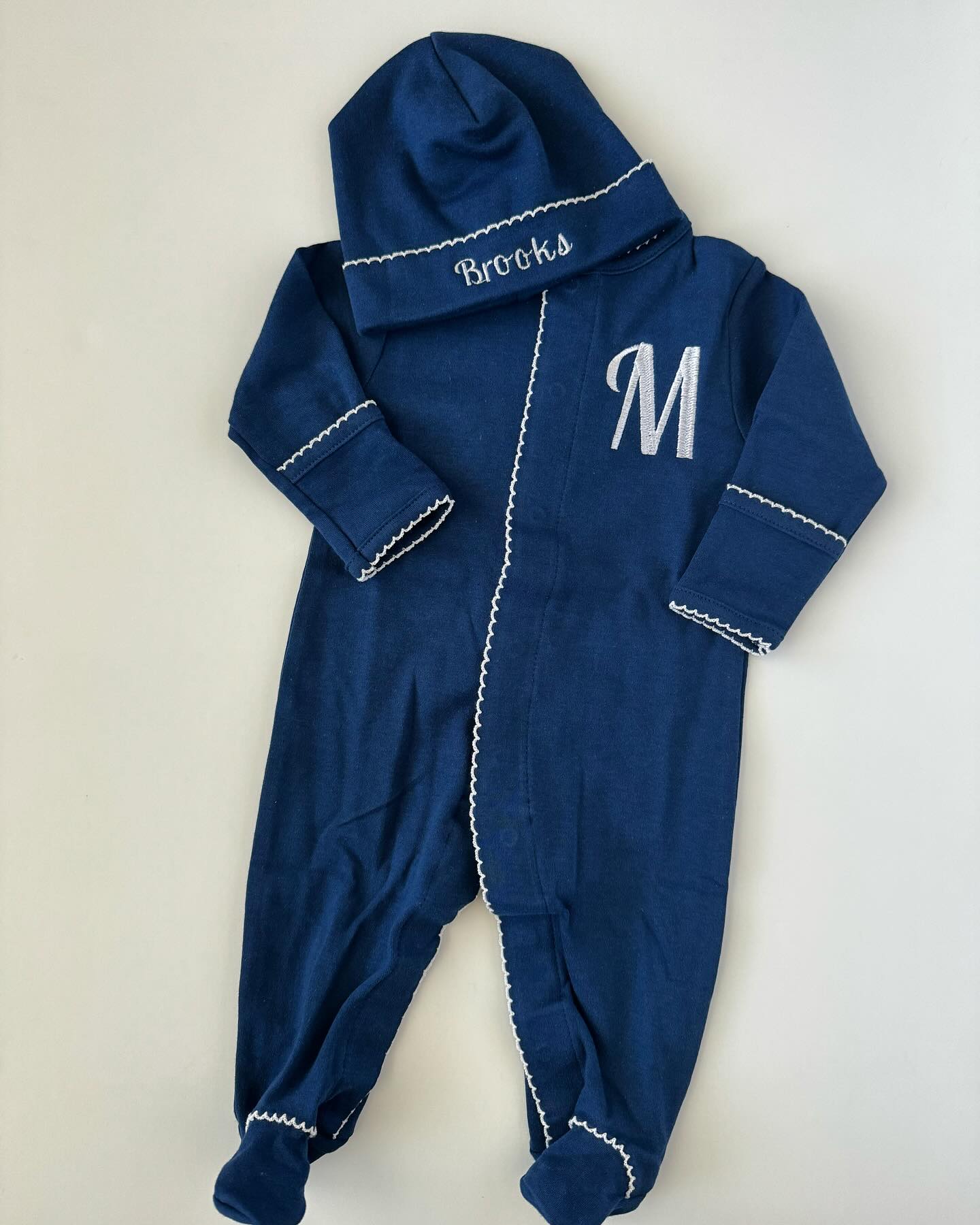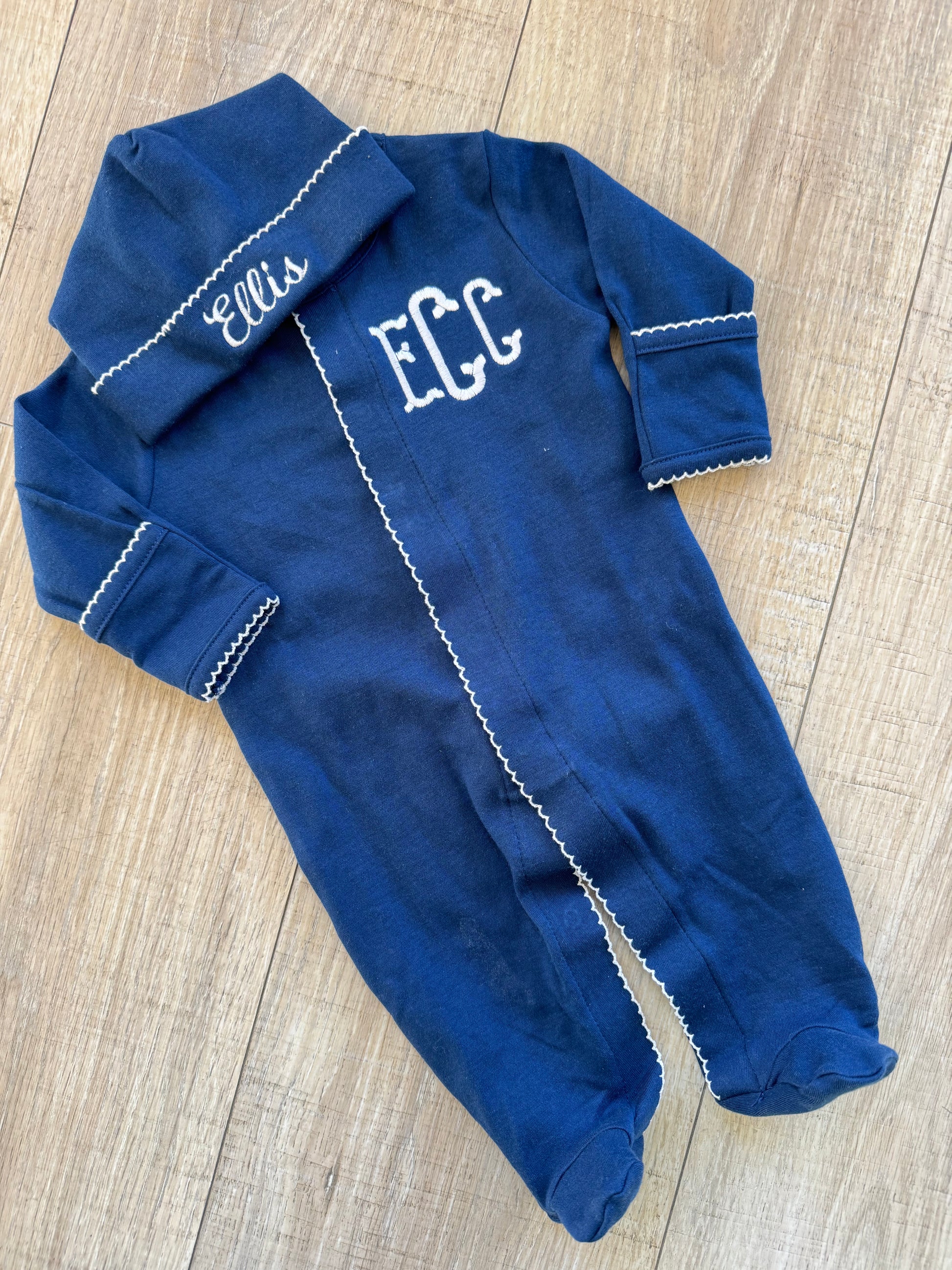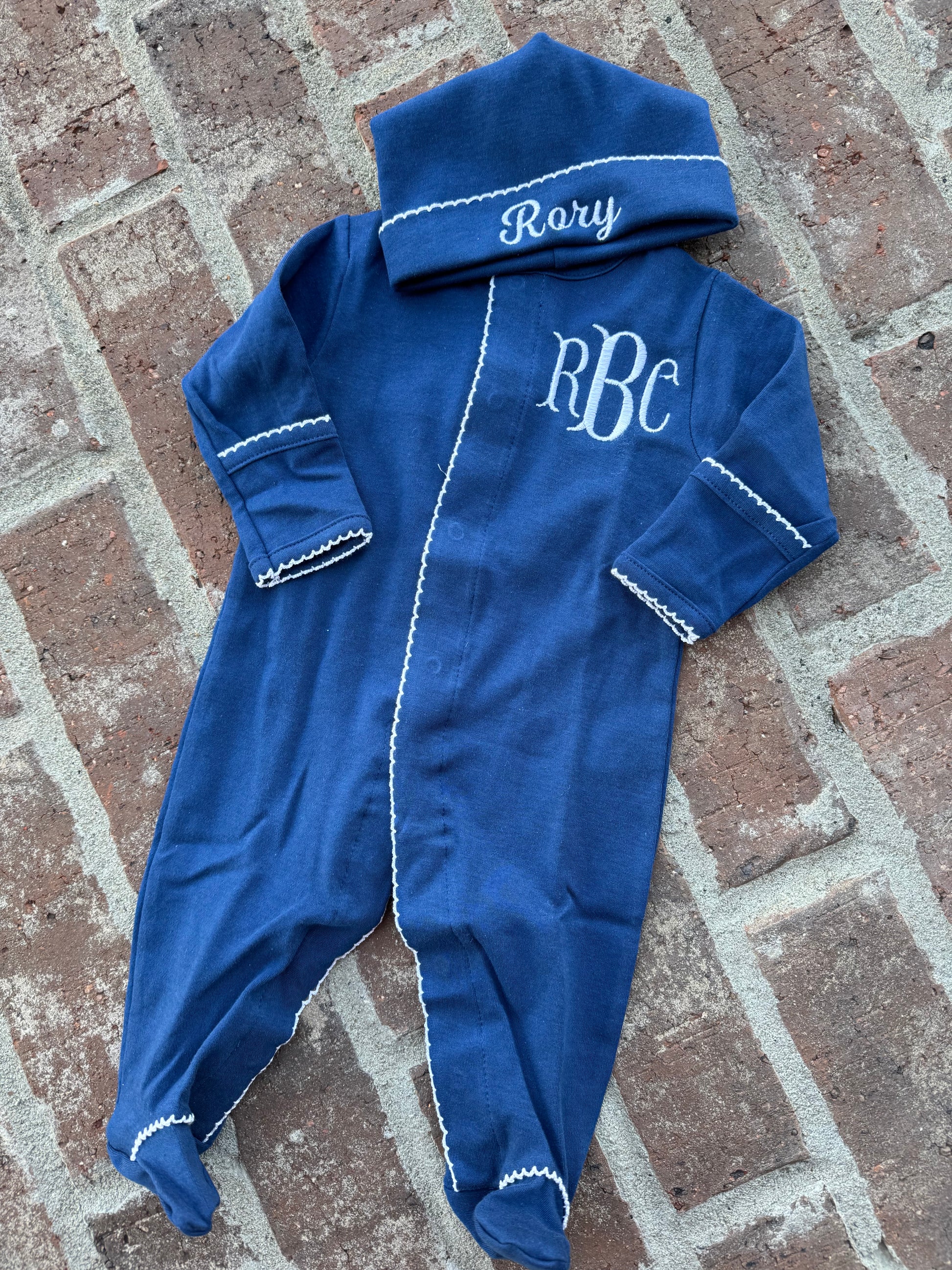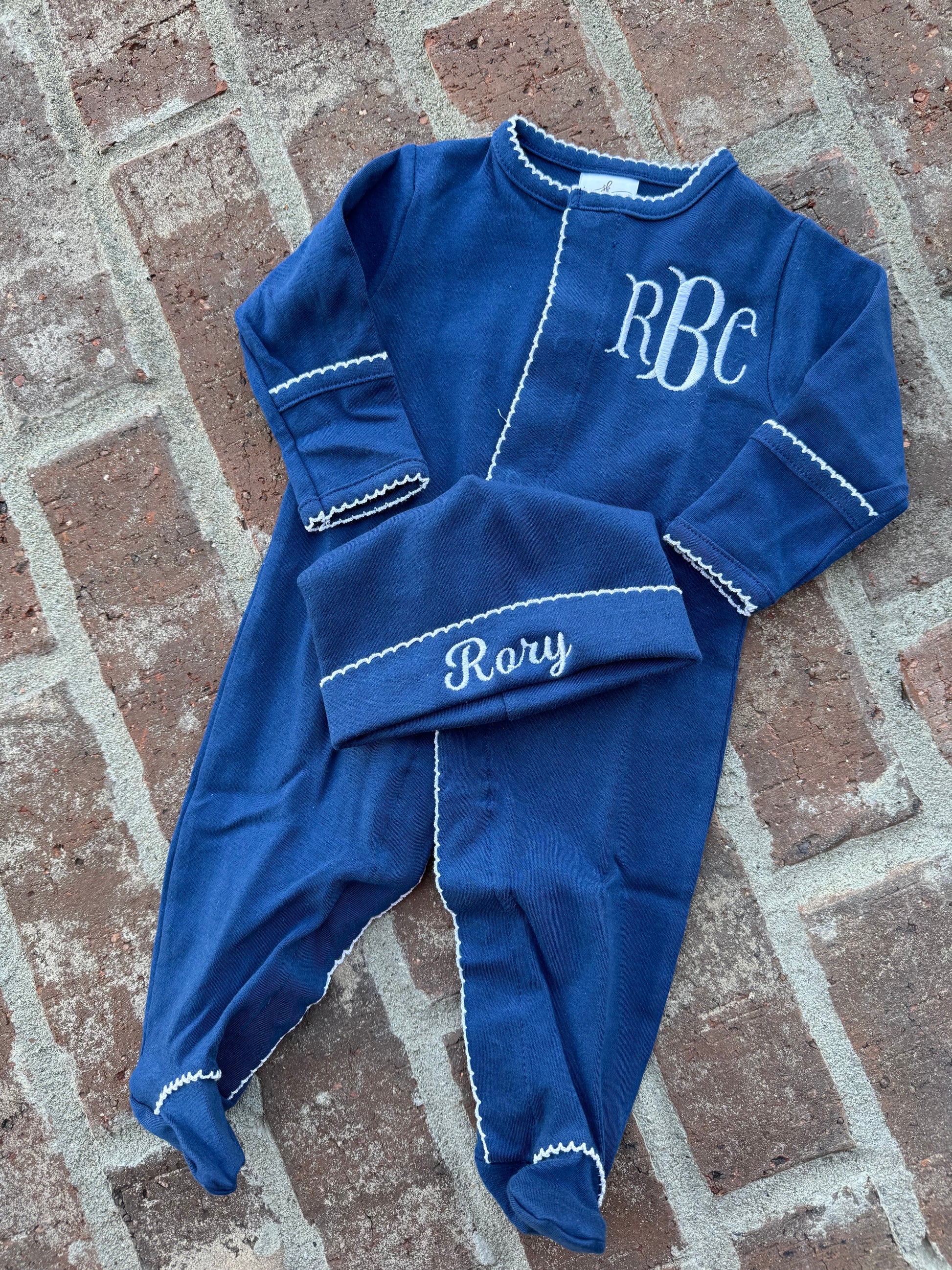 Navy with white picot trim footie and hat