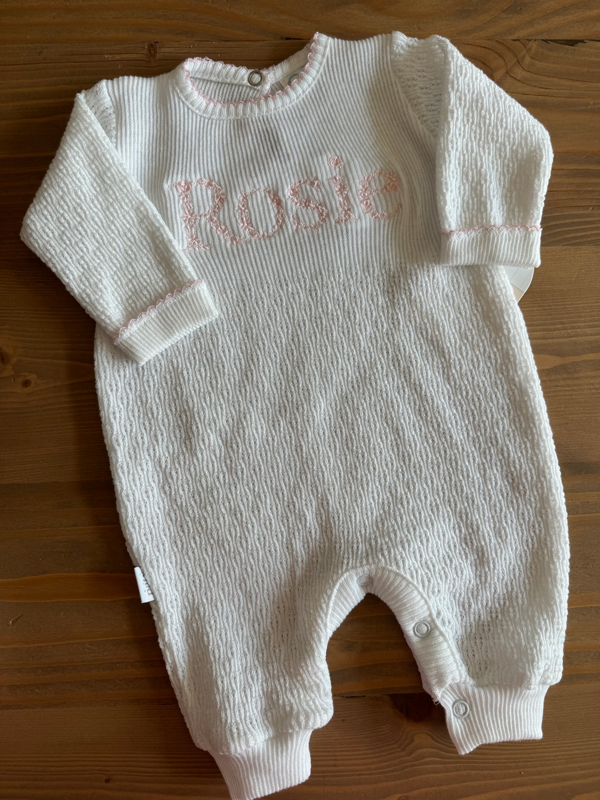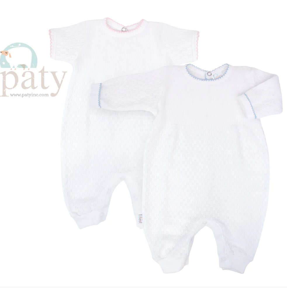 Solid white signature, 50/50 blend, Paty knit accented in pink or blue picot trim.