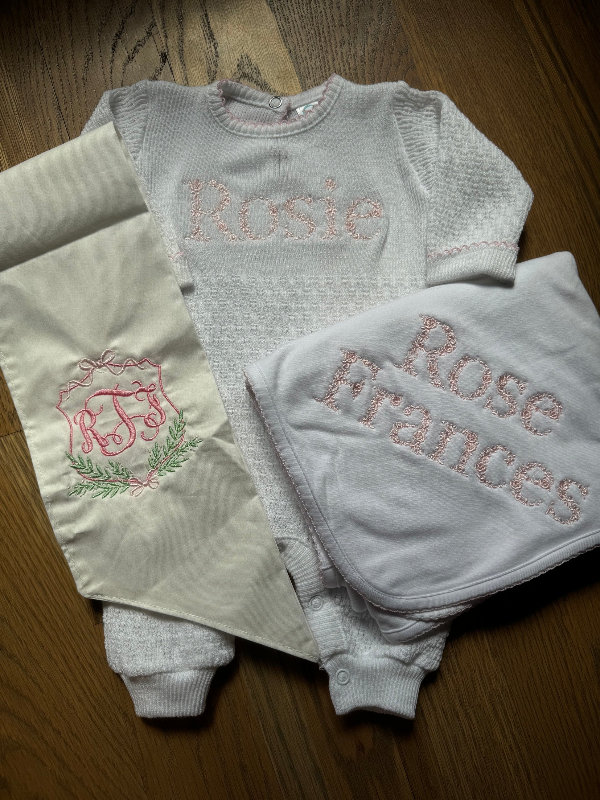 From baby announcement banners to embroidered backpacks for the first day of school to monogrammed totes for a bachelorette, and custom gifting, each item is crafted with care and intention.