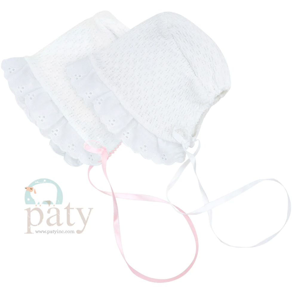 Paty Knit White Bonnet w/Eyelet Trim and Ribbon Tie