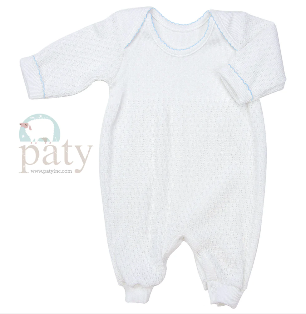 Solid white signature, 50/50 blend, Paty knit accented in blue or white picot trim.
