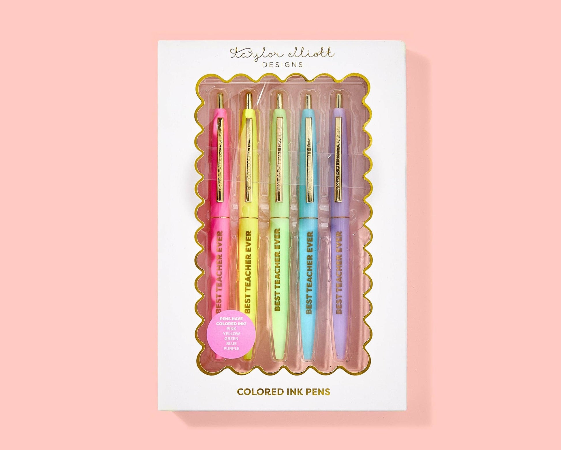 Make teachers feel special all year round with this perfect gift! Our medium ballpoint pen set comes with 5 fun colors, metallic gold foil details including the phrase "Best Teacher Ever" and super cute packaging! Pair this set with one of our notepads to make the gift even more special.