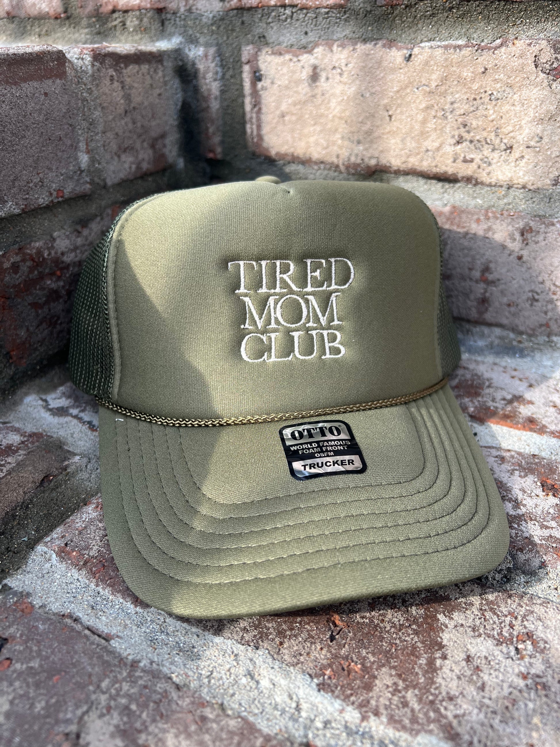 Olive trucker with “TIRED MOM CLUB” in beige thread